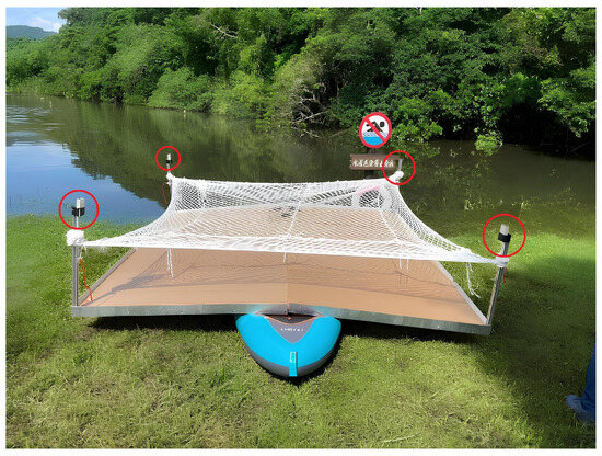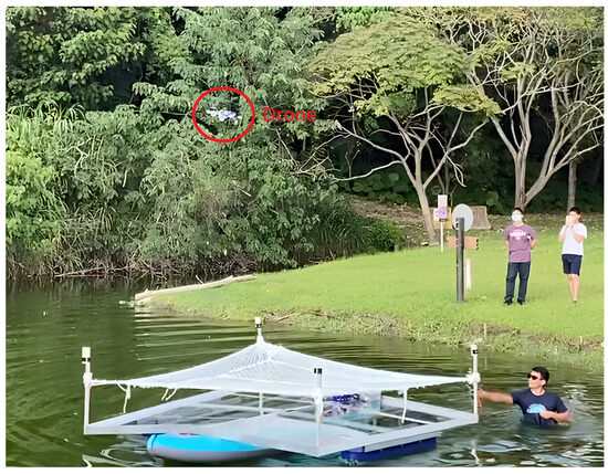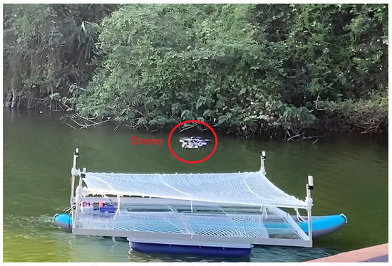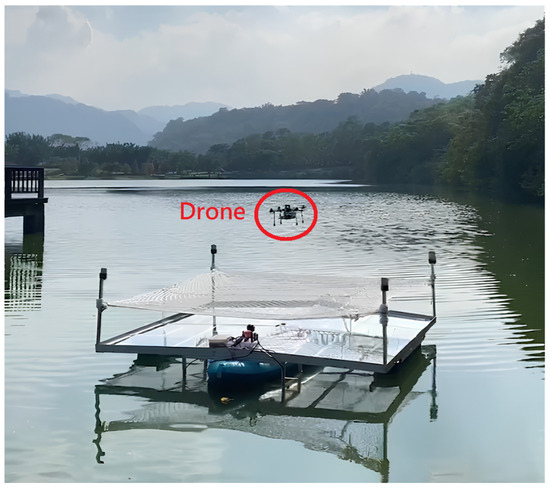 We installed the UWB module anchors at the four corners of the boat platform, forming a 3 m × 3 m square landing area, as shown in Figure 30. During the actual implementation phase, we will operate the boat on the surface of the lake and employ the module’s positioning system to facilitate the automated landing of the drone on the platform through the utilization of an algorithm. This approach is aimed at achieving a practical demonstration of the automated flying and landing capability.