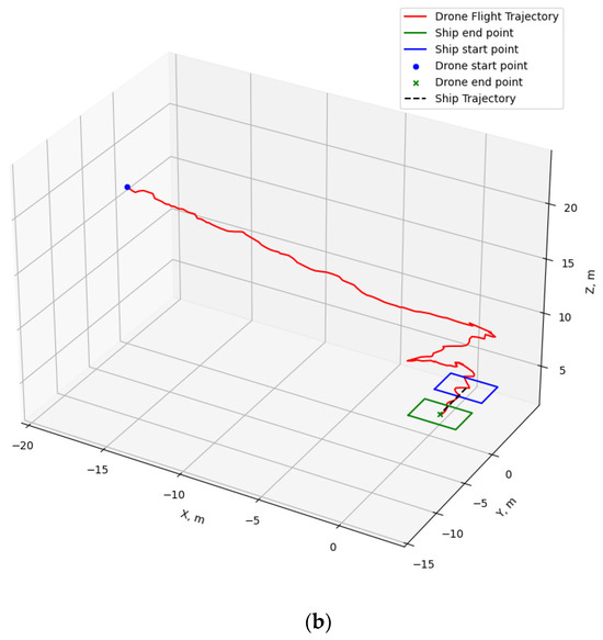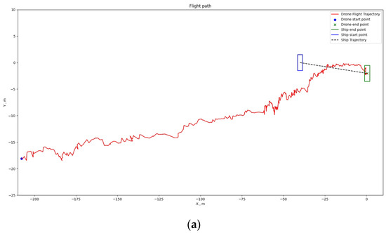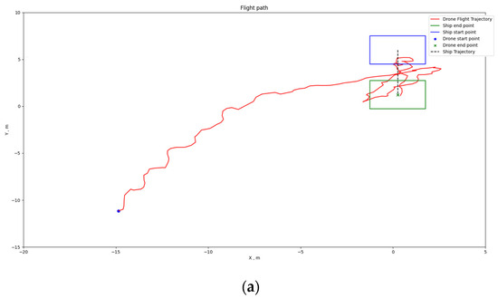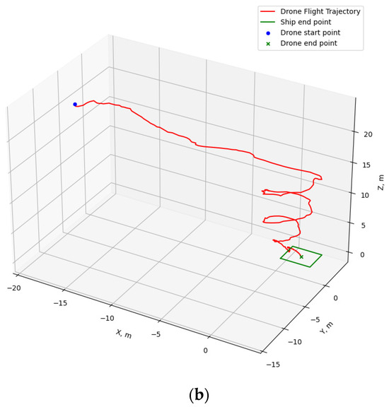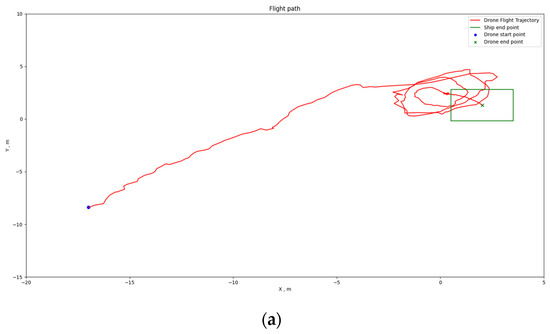 Analyzing the flight trajectory plots reveals that, regardless of the drone’s takeoff position, the shipborne flying and landing system effectively guides the drone’s direction in the XY plane towards the landing point along the shortest path. As the drone approaches the landing point, if its altitude remains significantly above the ship’s platform, the drone adopts a spiraling descent.