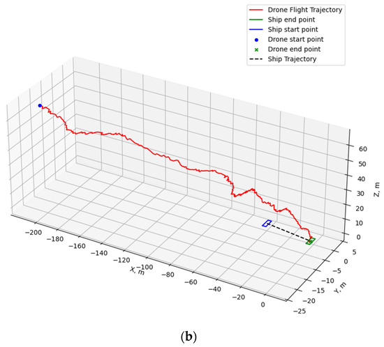 Figure 34a illustrates the 2D flight trajectory of the drone when the boat is stationary, while Figure 34b presents the 3D flight trajectory. The drone’s starting point is indicated by the blue circle, descending along the red trajectory line to the green “X” mark. The drone predominantly follows the shortest path towards the ship’s direction in the horizontal plane. However, as the drone approaches the boat horizontally, there is still a 12 m gap in the Z-axis. Consequently, the drone spirals down to the designated point, ensuring a safe and precise landing on the platform.