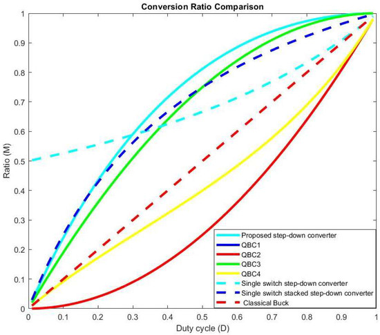 Upon careful consideration of Equation (3), it is obvious that the converter operates in a step-down mode, meaning it reduces the input voltage because M < 1. In order to provide a complete understanding, Figure 6 has been included, depicting a detailed comparison of the static conversion ratio between the proposed converter and the various types of step-down converters. This representation offers a clear understanding of the performance characteristics of the converters under study.