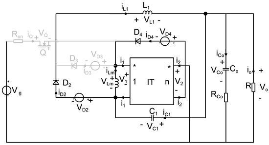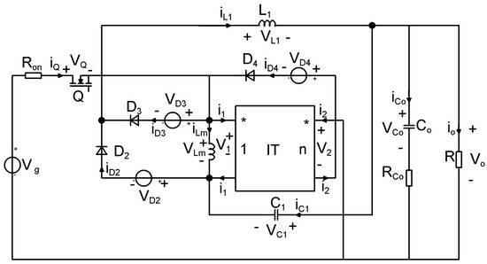 Because of inductor coupling, an equivalent model that involves an ideal transformer denoted as IT, with the magnetizing inductor LM, is used. The dotted ports of the ideal transformer define the directions for the associated voltages and currents. The converter model with these substitutions is shown in Figure 3. It is important to highlight that the equation for the ideal transformer can be formulated as follows:
