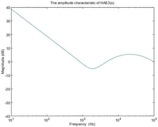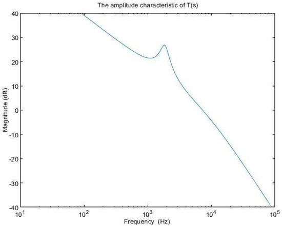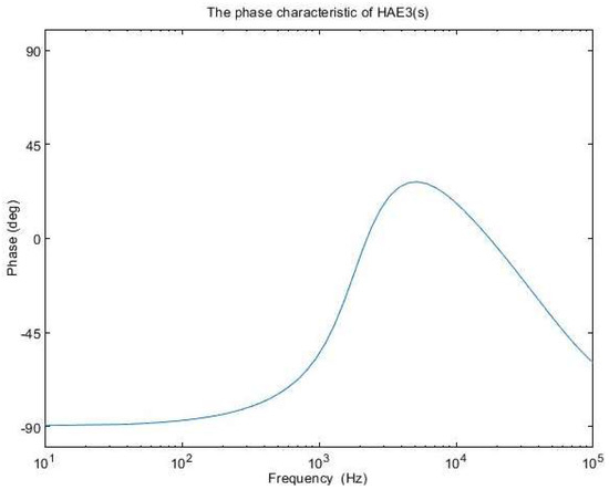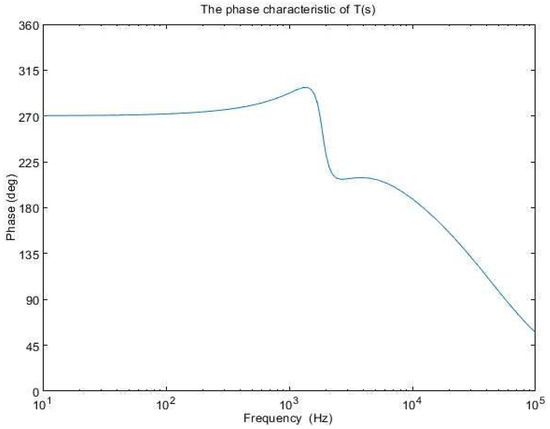 The amplitude characteristics of the error amplifier with these values is presented in Figure 11, while the open-loop transfer function amplitude characteristic is depicted in Figure 12. The phase characteristic of the error amplifier is sketched in Figure 13 and the phase characteristic of the open-loop transfer function can be examined in Figure 14. Examining Figure 12, it can be remarked that the amplitude characteristic is monotonically decreasing with a slope of −20 db/decade, except for a peak given by the high-quality factor in the denominator of (23). The real crossover frequency is 7.3 kHz, and the phase margin results in 20 degrees.