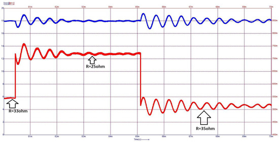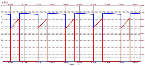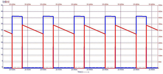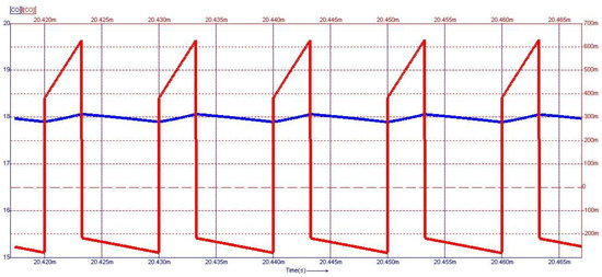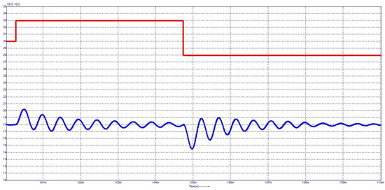 From Figure 15 to Figure 17, on the Y-axis-left side (blue color), the variation of voltage across the illustrated element is represented with the measurement unit in the international system [V]. Simultaneously, the Y-axis-right side (red color) depicts the waveform of the current through the component, represented in [mA]. Figure 18 shows the evolution of the output voltage at step changes in the input voltage that is modified from 30 V to 33 V and then to 28 V. It can be observed how, after the transient, the output voltage is regulated at the 18 V value described in the above requirement. In Figure 19, the converter behavior to step changes in the load resistance is presented. The initial load resistance is R = 33 Ω, then it is suddenly decreased to R = 25 Ω, and after some time, it is again increased to R = 35 Ω. Good regulation is observed in the output voltage revealed by the load current quasi-rectangular aspect. Each step change is accompanied by some ringing caused by the low phase margin value. A better transient response can be achieved by decreasing the crossover frequency at the expense of a longer response time.