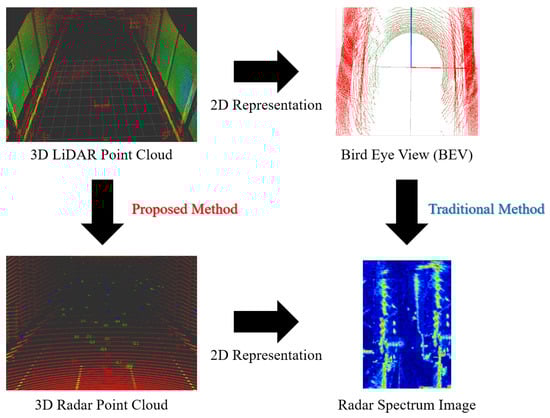 While previous research has predominantly revolved around image data, there are also numerous deep-learning-based translation methods focusing on data augmentation using LiDAR. An exemplary study is [], which delves into LiDAR translation. However, it has a noteworthy limitation: the loss of height information due to the representation of 3D point cloud data as 2D Bird-Eye-View (BEV) data. The BEV generated using LiDAR data typically represents a projection of a three-dimensional environment, which is changed into a two-dimensional perspective viewed from above. Recent investigations have begun to address this limitation by considering weather changes and height information into LiDAR translation, as evidenced in [,]. Despite image and LiDAR data dominating the translation research landscape, radar data have received comparatively less attention. Only a handful of research studies are dedicated to radar data augmentation. One prominent example is [], which harnesses CNNs in tandem with domain-specific data-augmentation techniques. However, this approach is time-consuming and best-suited to a limited scope of targets. Another radar data augmentation technique, introduced by Sheeny, M. in 2020, is parameterized radar data augmentation (RADIO) technique []. While it holds significance in the realm of radar augmentation employing deep learning methods, it confines its testing to simple target objects within small data sets and may lack stability, especially in comprehensive road environments. The proposed study centers its attention on radar augmentation and makes a substantial contribution by generating radar data derived from high-quality LiDAR data, thereby elevating the field of radar data augmentation.