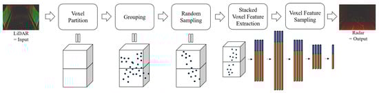 To address these challenges, we propose a deep-learning-based LiDAR-to-Radar translation network, which consists of voxel feature extraction modules that enable the translation from LiDAR to radar data. LiDAR and radar sensors organize data in the form of point clouds and are mainly used to measure distance. The point clouds from each sensor represent a collection of points that indicate the locations where light or radio waves are reflected from objects. The term “translation” is commonly used in the field of image translation, often referring to research where images are transformed into images of different styles, such as day2night and sunny2rain image translation. In this study, we define “translation” as the transformation of LiDAR points into radar points. LiDAR and radar are both in point format, and this can be considered a kind of style transformation. Figure 1 illustrates the purpose of this study. The voxel feature extraction module is designed based on voxel feature encoding (VFE) [], which divides the point cloud into 3D voxels of uniform intervals and transforms the point groups within each voxel into integrated feature representations. In essence, our proposed method compresses LiDAR point data into a format that resembles radar point data. This is possible because both LiDAR and radar sensors acquire point data through reflections from objects.