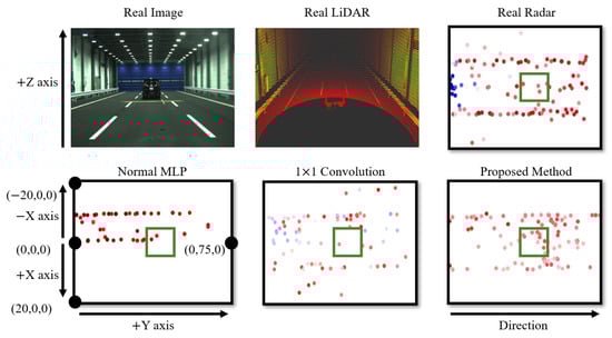 The primary role of the voxel feature extraction module is the encoding of LiDAR points. There are various methods for encoding LiDAR points, aside from the voxel feature extraction module. To assess the superiority of the voxel feature extraction module, we compared it with different representative feature extraction methods, such as original fully connected layer-based Multilayer Perceptron (MLP) [,] and 1 × 1 convolution layers [], for coordinate and RCS error comparison, as shown in Table 1. The comparative experiment was conducted using the JARI data set. To ensure an objective comparison, the sizes of filters, kernels, and other parameters for each method were standardized. As shown in Figure 7, a qualitative evaluation was also conducted.