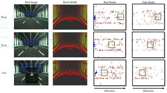 Using the optimized architecture, it is important to verify whether radar data are generated naturally, with low noise, from reliable real LiDAR data. In the second experiment, we qualitatively compared the generated radar data with actual radar data acquired in the same environment for verification. Figure 8 presents a comparison with the JARI data set, between actual radar data and radar data generated from LiDAR. In Figure 8, from left to right, the display includes a real image, a real LiDAR, a real radar, and a fake radar created by our proposed method. The height values of both the real and generated radar data are predominantly close to 0. Consequently, both the real and generated radar data are visualized as seen from above, and projected onto the z-axis at z = 0. The number on the results indicates the distance to the vehicle in front. In the radar data, the green squares represent radar points corresponding to the location of the vehicle. The color indicates RCS values, with blue representing lower RCS values and red indicating higher RCS values. In radar results, the coordinate in the center-left represents the position of the radar sensor. The distance increases, from the left to the right. In the real radar data of Figure 8, the point cluster that spreads horizontally represents the walls of the experimental space. However, in the generated radar data, the points representing walls are not reproduced as accurately. This discrepancy is because data are sampled based on the top K RCS values in the voxel feature sampling process. If we set a larger number for K, it would be possible to replicate more closely, but this would also include points with lower reliability.