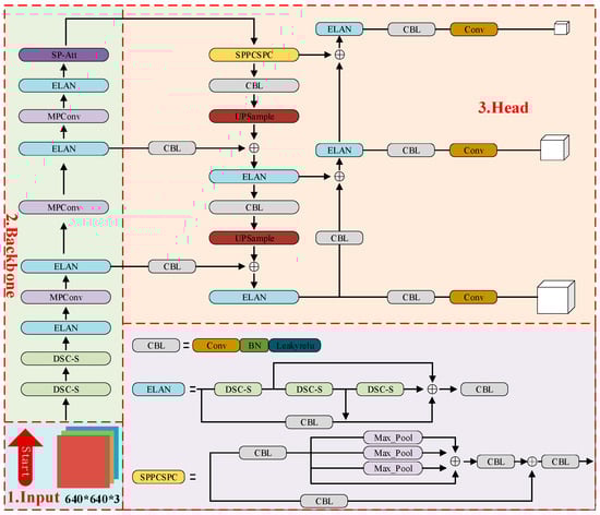 Figure 2 illustrates the processing of a 640 × 640 × 3 RGB image in Leaner YOLOv7-Tiny. Initially, the image is processed through two rounds of depthwise separable convolutions, leading into the ELAN module for efficient feature aggregation. This is followed by three combined structures of MPConv and ELAN. MPConv functions through dual branches, merging their outcomes for super-downsampling. The process then transitions to the SP module, which captures varied receptive fields, thus enhancing the comprehension and processing of multi-scale features. The final output consists of three feature map sets: 80 × 80 × 128, 40 × 40 × 256, and 20 × 20 × 512, at the neck output.