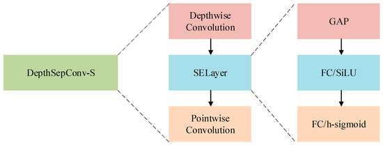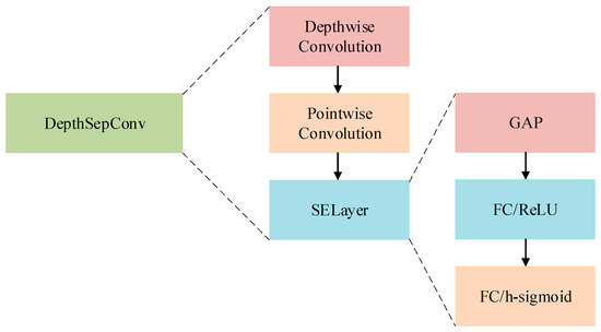 DepthSepConv convolution comprises three key components: depthwise convolution, a squeeze-and-excitation (SE) layer, and pointwise convolution. In depthwise convolution, each channel of the input feature map is processed independently. A convolution kernel convolves each channel to produce an intermediate feature map with an identical channel count. This process solely targets the depth dimension of the input feature map, excluding inter-channel interactions. Depthwise convolution notably diminishes parameter count and computational complexity.