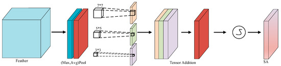 Acknowledging the integration of the SENet channel attention mechanism in the DepthSepConv-S network, a novel multi-scale spatial attention mechanism, named SP attention, is proposed. This mechanism enhances the basic spatial attention concept by incorporating multi-scale convolutional kernels. Such a design enables the capture of diverse receptive fields, fostering a deeper understanding and processing of features across various scales. The architecture of this mechanism is illustrated in Figure 5.