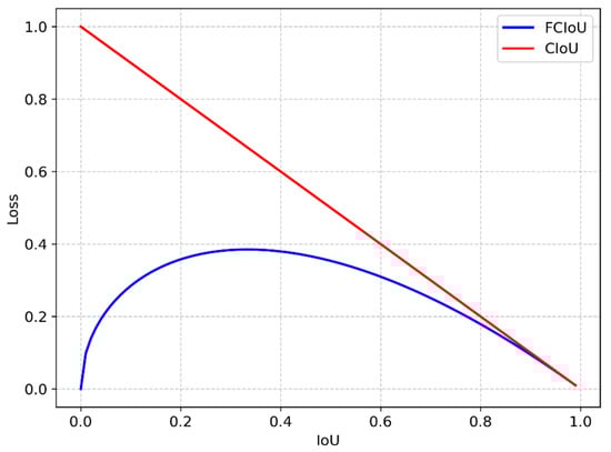 In the equation, = 0.5. Multiplying the CIoU Loss by parameter aims to balance the contributions of high-quality and low-quality samples to the overall loss. It elevates the impact of high-quality samples (with larger IoU) while suppressing the contribution of low-quality samples (with smaller IoU), as illustrated in Figure 6.