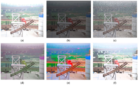 Six Example Images for Data Transformations. (a) Brightness Enhancement. (b) Reduced Brightness. (c) Noisy. (d) Color Shifted. (e) Color Enhanced. (f) Exposure.
