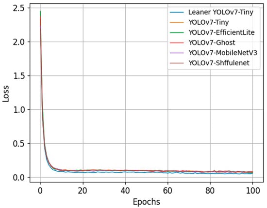 To clearly and accurately depict the changing trends of the loss function during the iterations of the six lightweight models, the loss curves during the iterative process of each algorithm were plotted using Matlab, as shown in Figure 9.