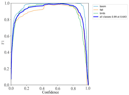 Figure 10 presents the F1 curve of the Leaner YOLOv7-Tiny model. The F1 score, a harmonic mean of precision and recall, serves as a critical evaluation metric in machine learning, particularly for certain multi-class problems. Ranging between 0 and 1, as defined in Equation (6), precision represents the accuracy rate, and recall represents the recall rate. The F1 curve offers a comprehensive performance measure. Analysis of Figure 10 reveals that Leaner YOLOv7-Tiny consistently achieves high F1 scores, particularly within the confidence range of 0.6 to 0.7.