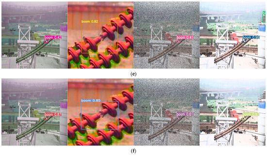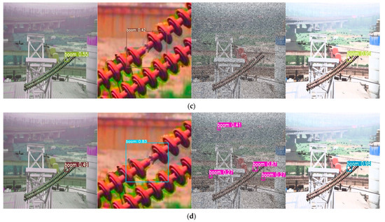 The scarcity of diverse fault data in transmission lines necessitated image transformations to assess the Leaner YOLOv7-Tiny model’s generalization and robustness. Techniques like brightness enhancement, reduction, and noise addition were applied to dataset images. These methods simulate various outdoor lighting, weather conditions, and viewing angles. This comprehensive strategy effectively validates the proposed method’s efficacy. The impact of these data transformations is depicted in Figure 8.
