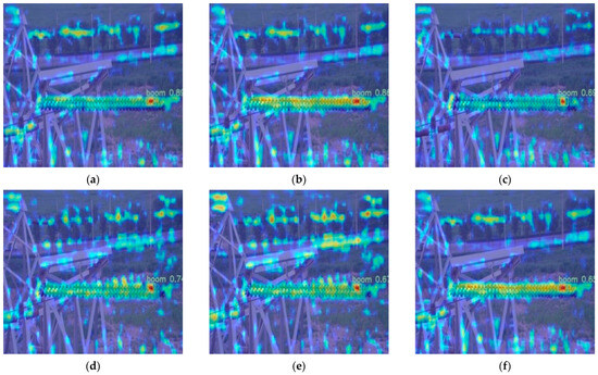 Attention Heatmaps. (a) Leaner YOLOv7-Tiny. (b) YOLOv7-Tiny. (c) YOLOv7-EfficientLite. (d) YOLOv7-Ghost. (e) YOLOv7-Shffulenet. (f) YOLOv7-Mobilenetv3.