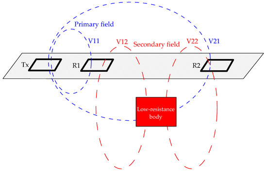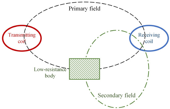 The working principle of the portable frequency-domain electromagnetic method is that a current with certain frequency information is supplied to the transmitting coil to generate an alternating magnetic field (primary field) around it, and the low-resistivity geologic body (referred to as the “low-resistance body”) forms eddy currents under the action of this primary field and generates a magnetic field (secondary field). As shown in Figure 1, the receiving coil is used to receive the primary field and the secondary field. When the distance between the transmitting coil and the receiving coil is unchanged, the primary field is unchanged. Therefore, the low-resistance body can be identified by analyzing the change in the secondary field on the profile.