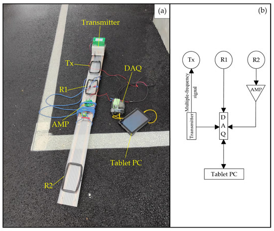 According to the device design for digital signal compensation, the prototype shown in Figure 5a was made. The dimensions of the transmitting coil, reference coil, and receiving coil are 20 cm × 10 cm. The seven-frequency pseudo-random signal is transmitted via the transmitter, and the synchronous transmission frequency includes 64 Hz, 128 Hz, 256 Hz, 512 Hz, 1024 Hz, 2048 Hz, and 4096 Hz. As shown in Figure 5b, a data acquisition card (DAQ) is used to directly read the induced electromotive force of the reference coil R1, and the induced electromotive force of the receiving coil R2 is amplified 106 times and then read with the data acquisition card. The data acquisition tasks of the two sets of signals are carried out synchronously.