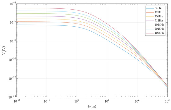 Based on the analytical response of the secondary field of the one-dimensional layered medium of the horizontal coplanar device, when the target body is infinitely extended and the resistivity is 10 Ω·m, the influence of the medium between the target body and the detection device is ignored (this layer is considered to be air), and according to the parameters of the detection device made and the emission current of each frequency in Table 1, the secondary-field-induced electromotive force received by the target body at different depths is calculated, as shown in Figure 6.