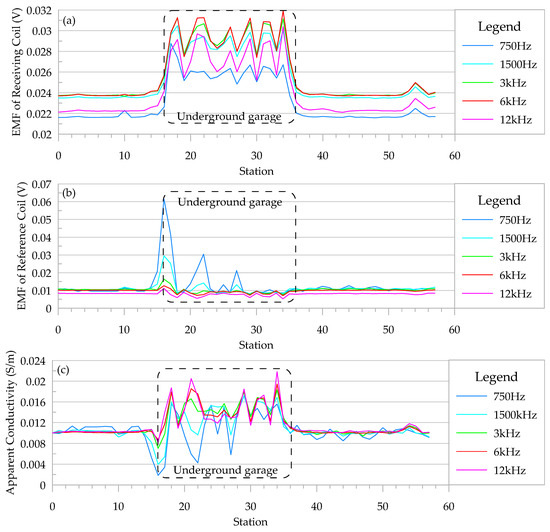 Abnormalities caused by underground parking under simulated signal compensation conditions. (a) EMF of receiving coil; (b) EMF of reference coil; and (c) apparent conductivity.
