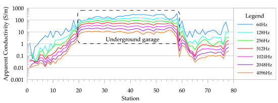As shown in Figure 8, the steel bar in the roof of the underground garage caused obvious high apparent conductivity anomalies, and the apparent conductivity gradually increased as the starting end approached the underground garage. The apparent conductivity of 64 Hz was the highest, and the apparent conductivity gradually decreased with the increase in the frequency. The conductivity changes at frequencies above 512 Hz were basically the same. The conductivity stability of the frequency below 512 Hz was poor, and the apparent conductivity above the steel bar was relatively stable. The conductivity of the steel bar was high, generally greater than 10 S/m. Compared with analog signal compensation, the apparent conductivity caused by digital signal compensation was higher, and obvious field value changes could also occur near the garage, indicating that the apparent conductivity data obtained via digital signal compensation were more reasonable.