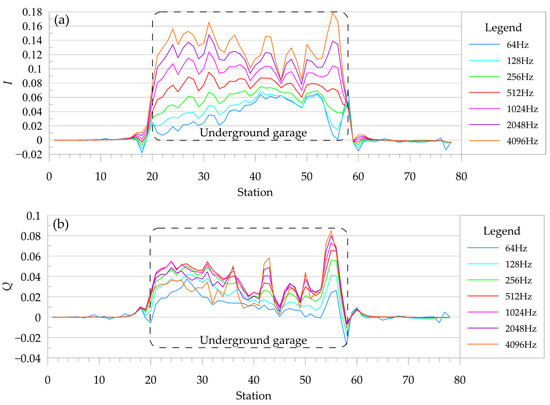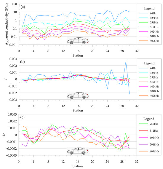 The survey line was far away from the car, so the anomaly caused was weak. As shown in Figure 11, the amplitude of the apparent conductivity and the real component (I) and the virtual component (Q) of the normalized secondary field changed minimally. Station no. 16 was the center of the car, where the apparent conductivity and the real part of the normalized secondary field had high anomalies. The anomalies in the real component of the normalized secondary field were clear, while the noise in the virtual component was heavy. It can be seen in Figure 11b that the 64 Hz and 128 Hz curves in the real component of the normalized secondary field no longer have an anomaly. The virtual component of the normalized secondary field makes it difficult to identify anomalies caused by the car even after removing the noisy 64 Hz and 128 Hz curves.