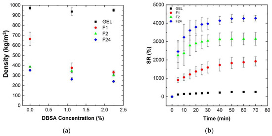 Density and swelling ratio (SR) of PVA/PEDOT:PSS hydrogels with 1.12wt% DBSA: gel (GEL) and foams (F1, F2, F24) prepared at several mixing speeds ranging from 300 rpm to 24,000 rpm (Table 1): (a) density as a function of DBSA concentration; (b) swelling ratio as a function of time.
