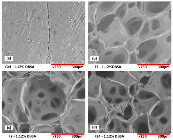 For hydrogels without DBSA (Figure 4a), the foam is not stabilized, which leads to the collapse of air bubbles before the end of the reticulation process. Therefore, such hydrogels exhibit an intermittent structure composed of areas of a dense gel phase, mostly present at the bottom of the sample, and areas with a porous structure, preserved by the reticulation process. For hydrogels prepared with DBSA, stable porous structures are obtained (Figure 4b,c). A DBSA content of 1.12wt% leads to a relatively homogenous pore size (Figure 4b), while a DBSA content of 2.24wt% leads to more heterogenous pore sizes.