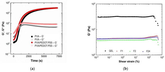 Gelation of hydrogels and viscoelastic properties under shear strain: (a) evolution of G′ and G″ as a function of time at 25 °C for PVA- and PVA/PEDOT:PSS hydrogels (GEL, 1.12%wt DBSA); (b) variation of the elastic modulus (G′) with shear strain at a fixed frequency, f = 1.0 Hz.