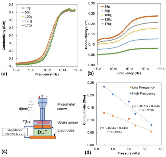 Conductivity of PVA/PEDOT:PSS hydrogels with 1.12wt% DBSA: (a) gel, (b) foam F2 (mixing speed 2000 rpm), (c) scheme of the experimental set-up (d) conductivity as a function of pressure as analyzed from (b) at 0.1 Hz (low frequency) and at 1.0 × 105 Hz (high frequency).