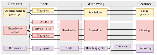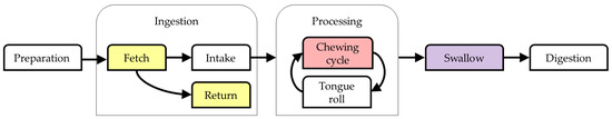 A simplified scheme of the different eating stages from Schiboni and Amft [15]: food preparation, ingestion, processing, swallowing, and digestion. The colours indicate where the different sensors used in this research operate in the eating cycle: yellow for the accelerometer and gyroscope, orange for the piezoelectric sensor, and purple for the respiratory inductance plethysmographic sensor.