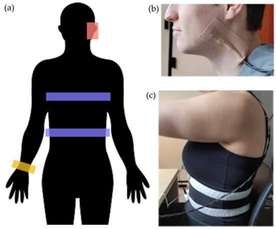 The experimental setup of the sensors. (a) Illustration of the sensor locations, with red showing the location of the piezoelectric sensor, purple the two belts of the respiratory inductance plethysmographic sensor, and yellow the smartwatch worn on the wrist. (b) The piezoelectric sensor worn by a test subject, attached to the angle of the mandible of the jaw with tape. (c) The belts of the RIP sensor worn by a test subject.