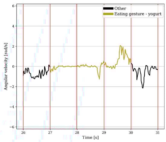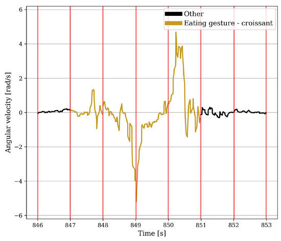 The accelerometer and gyroscope data were kept in two formats, namely, the raw data and a high-pass filtered data. For the gyroscope, this process was executed to compensate solely for drift, whereas for the accelerometer it was conducted to address both drift and gravitation. The eating gesture features were based on the work by Fallmann et al. [18], Merck et al. [25], and Fortuna et al. [17], in which the data were split into windows of one second. These features were combined with standard statistical features such as the maximum value, minimum value, and standard deviation, resulting in ten gyroscope features and seventeen accelerometer features. Figure 4 and Figure 5 show two instances of rotating around the axis of the underarm for an intake gesture. The angular velocity for the intake gesture of eating yoghurt is constant while the spoon is brought to the mouth. This must be done in a controlled manner to avoid spilling the yoghurt. Because there is no chance of spilling, the angular velocity of the intake gesture for bringing a piece of croissant to the mouth in Figure 5 is more abrupt.