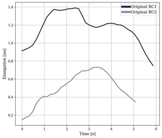 Two examples of breathing cycles (BC) shifted in time to fit a single figure, in which the lung volume is estimated by adding the data from the belts around the abdomen and the ribs.