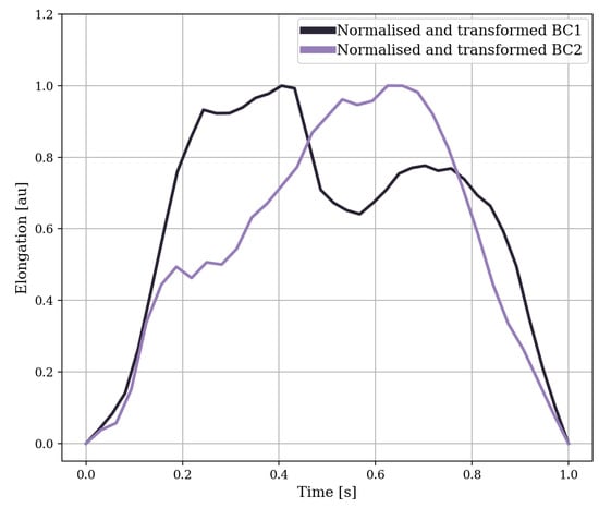The normalised and transformed version of the breathing cycles from Figure 6. The normalised breathing cycles were normalised in time and amplitude between zero and one and transformed such that and were zero.