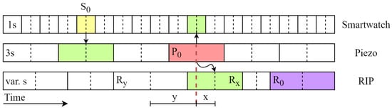 Schematic representation illustrating the extension of feature vectors by appending and prepending windows to the feature vector alongside their respective features. In this specific instance, the piezoelectric sensor window P0 is being categorized as chewing and the amalgamation of all three sensors generates a feature vector. First, the green windows R0 and S0 are linked to P0, as described in Figure 8. Then, extra windows are added depending on the feature vector configuration. In this example configuration of 3 s–3 s, three one-second smartwatch windows are added both before (, , ) and after (S1, S2, S3). Additionally, one three-second piezoelectric sensor window is included before () and after (P1) and a single variable-length window of the respiratory inductance plethysmographic (RIP) sensor is added before () and after (R1).