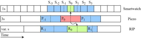 The number of windows to be added to the feature vector is based on the window size. To ensure equal feature vector sizes, which is necessary for the machine learning algorithms, the average breathing cycle duration of 3.6 s was taken to determine how many RIP windows were to be added to the feature vector. In this 3 s–3 s configuration, three windows of one second each are added on both sides of the linked smartwatch window, one three-second window is added on both sides of the piezoelectric sensor window, and one window of varying length is added on both sides of the linked RIP window. This results in a feature vector with features of thirteen windows.