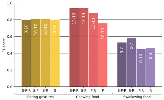 The highest -scores of the different sensor combinations for the classification of eating gestures, chewing food, and swallowing food. The characters S (smartwatch consisting of accelerometer and gyroscope), P (piezoelectric sensor), and R (respiratory inductance plethysmographic sensor) denote which sensors were used in each case. The white text indicates which feature vector size was used to acquire the highest -score among all feature vectors for that specific sensor combination.