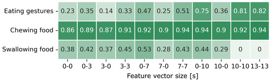 Figure 11 illustrates the -scores for the different feature vector sizes of the three sensing measures. For the classification of eating gestures, the highest -score of 0.82 was achieved with a feature vector size of 13 s–13 s. In the classification of chewing food, an -score of 0.94 was acquired using a 7 s–7 s feature vector size. The classification of swallowing food resulted in the highest -score of 0.53 with a feature vector size of 0 s–7 s. The eating gesture and the chewing food classifier showed lower performance when feature vectors solely contained data from the past compared to vectors incorporating both near-past and future data or solely future data. However, for chewing food this difference was relatively small, and this relationship was not found in the classification of swallowing food.