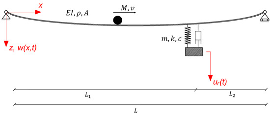 Simply supported Bernoulli–Euler beam with an attached SDOF system acting as the TMD and a moving point mass traversing the beam’s length.