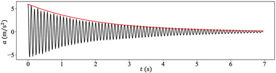 The free vibration accelerogram of the SDOF system following an impact hammer excitation with the red curve showing the exponential decay of the amplitude.