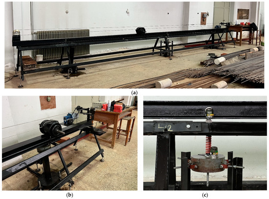 Experimental setup showing the (a) simply supported beam; (b) the moving mass with the electric motor driving it through a wire, plus the base station at the right end; and (c) the TMD with the four metallic guides to ensure vertical motion only.
