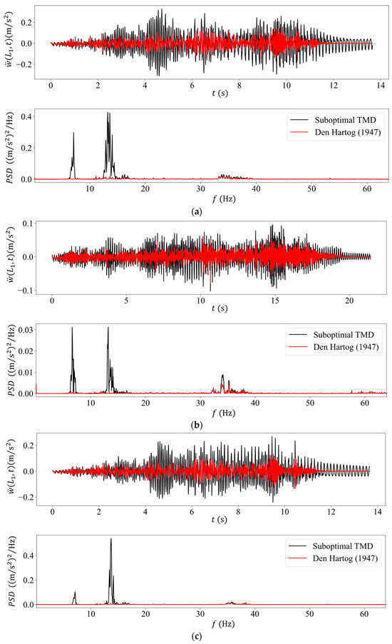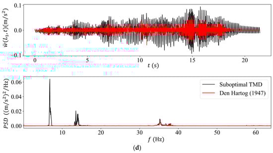 Numerically computed acceleration time histories (top graph) and their PSDs (bottom graph) for the sub-optimal TMD used in the experiments (black color) versus the optimum TMD as defined by Den Hartog [13] (red color) for the intermediate sliding mass case of (a) , (b) , (c) and (d) .