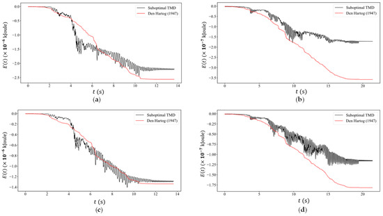 Energy accumulation over time in the sub-optimal TMD used here (black color) versus the optimum TMD as defined by Den Hartog [13] (red color) for the sliding mass cases of (a) , (b) and (d) .