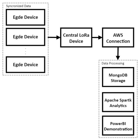 Figure 1 provides a schematic illustration of the methodology adopted in this study. The methodology revolves around a network of sensor devices (i.e., edges) to gather the data. The edges are interconnected with a central LoRa device that serves as a data aggregation and transmission hub. In order to ensure the robustness of data collection and minimize packet loss, the edges are synchronized with the central LoRa device. Note that this synchronization mechanism allows each edge to transmit data at fixed intervals, preventing collisions and ensuring seamless communication. Once the central device aggregates the data from various edges, they are transmitted to the AWS (Amazon Web Services) platform over the Internet.
