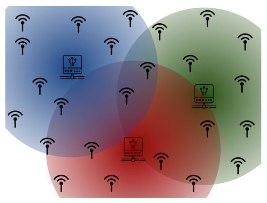 A functional structure of this configuration can be seen in Figure 2. This way, each edge device communicates with a central device, where devices in the Blue Ray communicate with the gateway in their region. Devices that share regions, as illustrated in the intersections of gateway boundaries, will only communicate with one device, as the bands are different for each central device. This approach ensures the well-known security of the LoRaWAN protocol with ABP, OTAA, and other standardized functionalities in systems without compromising performance but with a significant cost reduction for use in small areas (like super blocks or condominiums) with simple installation.