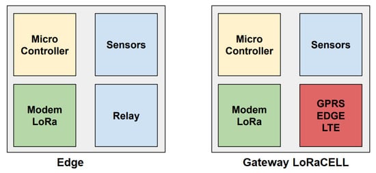 Note that this approach differs from the original LoRaWAN once it implements a single LoRa channel per gateway, maintains a limited number of edge devices per gateway (typically fewer than 30), and covers only 10% of the area compared to the standard LoRaWAN approach. Moreover, the commercial value of the gateway sees a reduction, lowered by a factor of 100. The LoRaCELL gateway does not exceed USD30.00 in its assembly, compared to the LoRaWAN gateway at USD3000.00 for 5000 edge devices in Brazil. Thus, the LoRaCELL system has only one hardware for its devices; the gateway is an edge device with the addition of a GPRS, edge, or LTE radio for sending the data collected from other devices via the cellular network. Figure 3 illustrates this difference.