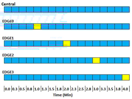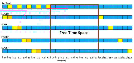 Figure 5 depicts the synchronization pattern between the devices. The central accesses real time due to its Internet connection. The five edges will send messages at random times. One of them, the central, will receive and call edge0, returning the edge code to it and the delay time to send its first message. If it receives code 0, it will wait until its time reaches 10 min. The next message will be at 40 min. After that, the four edges will send messages at random times. The central will receive and call edge1, returning the edge code to it in real time. If it receives code 1, it will wait until its time reaches 11 min. The next will be at 21 min. This will continue until all devices are synchronized. Note that the central switches to send mode shortly after receiving the edge synchronization message. It then returns to receive mode to receive sensor data and other synchronizations. The free time space is the time between synchronizing and sending the first messages. This space was designed so that, even with the greatest conflict between synchronization messages, all devices are synchronized after a time. The yellow blocks show times when devices are sending messages over LoRa, while the orange blocks show when they are ready to receive messages only. The blue ones are when they are available for both cases.