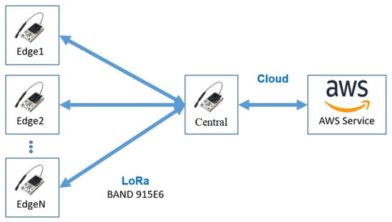 Figure 6 shows the communication structure of LoRa N2P in this application. Note that it has N edge devices sending JSON (JavaScript Object Notation) to the central device. The central device receives these data and sends them to Amazon’s AWS service. The chosen connection method for linking the gateway and the AWS is GPRS. Although other communication methods like 4G LTE or 5G are possible, their implementation would increase the contract cost for the customer without offering significant improvements in our data transmission structure. Data, limited to JSON files of a maximum of 12 kB, are sent through the gateway every minute. Given the modest size of these files, the GPRS data transfer speed (80 Kbps) is sufficient to ensure timely delivery without incurring higher costs.