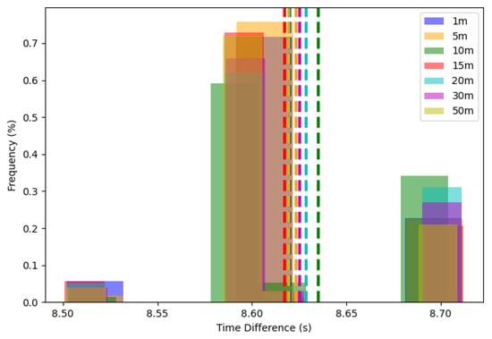 By configuring these parameters, a data rate of 7.81 kbps could be achieved []. Despite the relatively low transmission speed, this configuration offers enhanced reliability regarding device-to-device distance. Consequently, connecting more street lamps to the same switchboard becomes feasible, even though it necessitates longer time intervals between messages compared to the one-minute intervals in other scenarios.